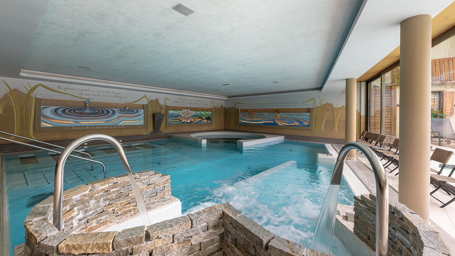 - Piscina interna di 95 m² riscaldata a 31°C dotata di percorsi idromassaggio, getti cervicali e ampie vetrate.